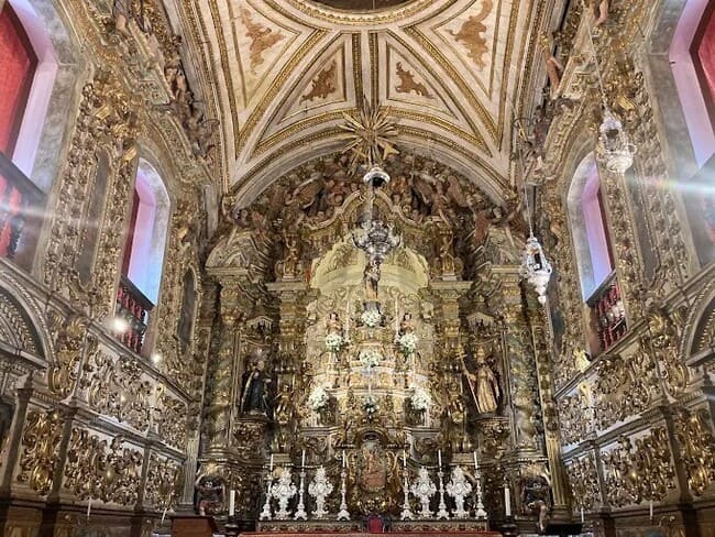 • O interior é ricamente decorado com painéis de ouro que cobrem grande parte do teto, dos altares e das colunas — resultado da expressiva produção artística da época.