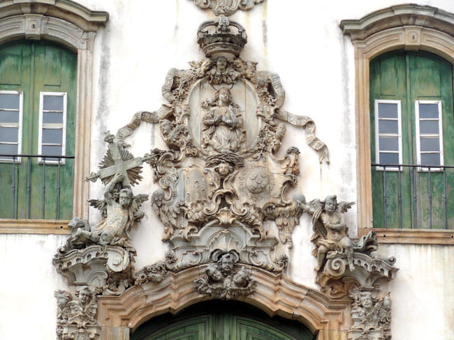• A fachada apresenta entalhes em pedra‑sabão e a decoração interna mescla elementos barrocos e rococó, com relevos e detalhes impressionantes.